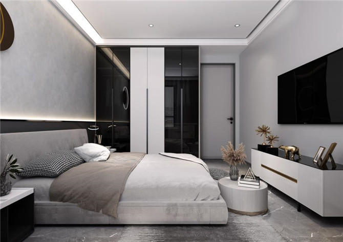 将简约风格糅杂入轻奢风格设计,突出了现代设计的轻装修、重装饰,黑色的线条强调了空间的边界,与暖色的线性灯光形成强烈反差,柔软的床采用弧线的造型,更强调了慵懒的舒适的家装效果。