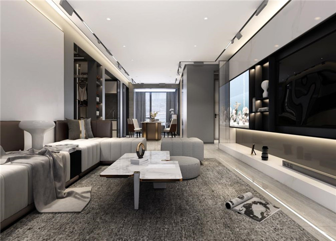 客厅大量线性光线的使用,让整个空间更加简洁、线条清晰。整个客厅色调在咖色中徘徊,浅咖、深咖、暖灰,相似色不同材质展现出一个优雅、安静且温暖的生活空间。
