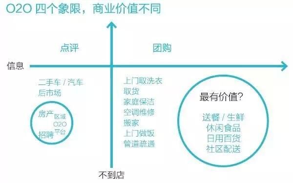 所以我们把当前所有O2O的公司分在了这四个象限当中,比如说通过信息来产生一个到店行为的有大众点评,美国有TripAdvisor和Yelp。全世界这类的商业公司加起来整个市值差不多200亿美金左右。右上角的团购,美国有groupon和livingsocial,中国有美团、窝窝团,加起来差不多是200亿美金,这两个市场都在跌。左下角更多,像原来的传统58同城、赶集、安居客等等。大家可以发现,左下角的公司会非常快速做集中化,这些公司会大鱼吃小鱼,可能中国未来只有极少数这样的公司。因为不到店的信息层都是相对比较轻的交互,这个地方是最容易产生赢者通吃的局面。这个领域的市场价值可能也就在200亿美金左右。但是你会发现好多别的象限的公司却开始在做右下角的事,你想想这几个公司的动作,美团在做外卖,58同城在做58到家。