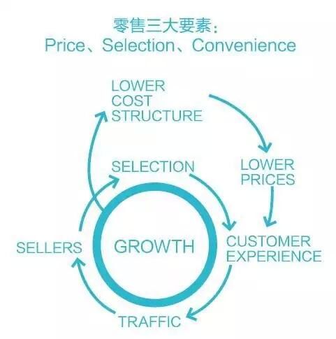 这是京东决定做O2O切入路径层面的逻辑,还有一个更加基础的逻辑,这个是本源性元素。再看第二张图(见下页),这张图是亚马逊的创始人贝索斯在1997年手绘的,它揭示了亚马逊今天作为一个将近2千亿美金的公司发展的原动力。