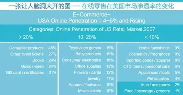 这是2007年的互联网报告,这张图讲的是不同品类在互联网的渗透率,分别是大于20%的,介于10%—20%之间的,小于10%的。左边包括电脑产品、书,各种票、音乐和视频,中间包括婴儿用品,右边的包括家具、大型电器、汽车配件等。
