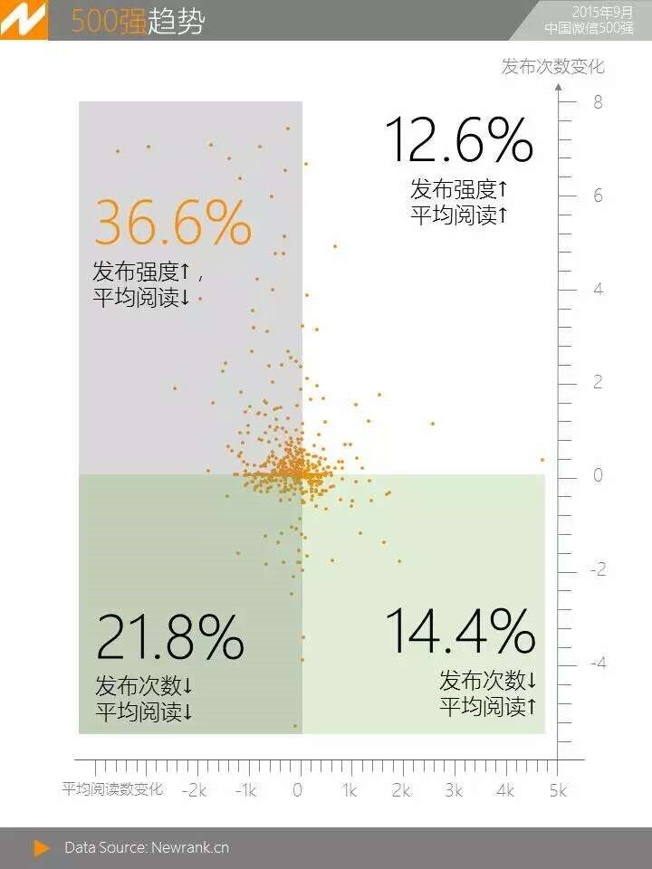 9月,阅读量的颓势雪上加霜。新榜《中国微信500强2015年9月月报》发现,500强账号中,有60.4%仍在提高发布强度,却仅有30.2%平均阅读数有所增加,36.6%的账号陷入越努力越没人看的尴尬境地。
