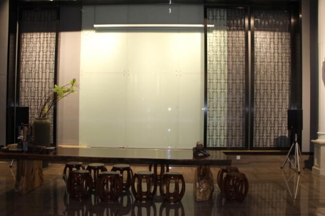 王宏伟的办公室,原本设在御家瓷砖总部展厅的二楼,里面摆满了书画、陶艺、茶具之类的东西,非常有文艺气息,时常高朋满座。现在,他把自己的办公室搬到了一楼大堂旁边,那是个有180平方米的空间,层高6米,里面有酒吧、图书阅览区、书画桌、投影仪,酒吧里有洋酒,红酒和咖啡即将“进驻”,被他命名为“御家文化吧”,来的人就更多了。今年10月1日,王宏伟在这里宴请朋友,并美其名曰“御宴”。