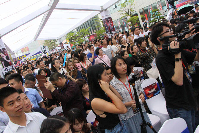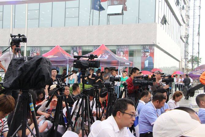 好吧,冲着明星,下再大的雨没伞遮挡咱也能忍,座位被别人占了咱也能忍,用手机拍照的人老是挡着镜头咱同样能忍。看看吧,一排的摄像都在那戳着呢,有的打着伞,有的给摄像机套着袋子,五六十家媒体的代表都是“在风中”,“在雨里”。连主持人都是靠礼仪小姐打伞才能上台说话——你说你这个昊晟企业,搞户外活动也不请诸葛亮掐指算算是什么天气?