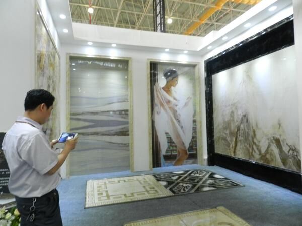 一名参观者在拍摄御家瓷砖的产品