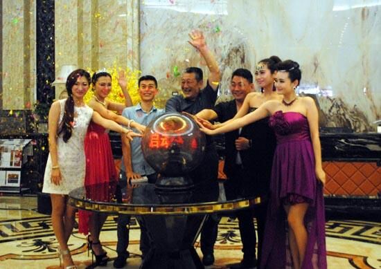 王宏伟(右三)、王建华(左三)、张裕民(中间)和四位模特共同启动御家瓷砖“‘御’见幸福”主题摄影活动启动仪式