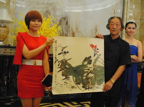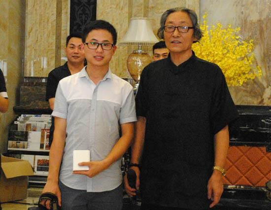 最具人气微信奖获得者手持奖品吴春生价值万元画作和画家吴春生合影