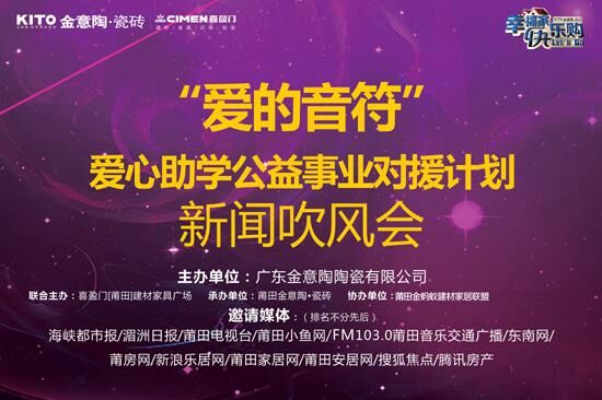 广东金意陶陶瓷有限公司华东大区总经理何旭,喜盈门[莆田]建材家具总经理丛艳霞,莆田金意陶·瓷砖总经理李金仔,广东金意陶陶瓷有限公司项目创意总监张贵权等领导嘉宾以及海峡都市报、湄洲日报、莆田电视台、莆田小鱼网、FM103.0交通音乐广播、东南网、莆房网、新浪乐居网、莆田家居网、莆田安居网、搜狐焦点、腾讯房产等近20多家具有公信力,影响力的媒体出席本次爱心公益对援计划媒体吹风会,共同启动与见证9月29日金意陶·瓷砖群星音乐会暨万人狂欢“爱的音符”爱心助学篇章。