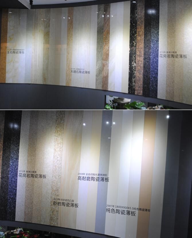 记者了解到,蒙娜丽莎陶瓷薄板产品从花色上分为六大系列,分别是玉石陶瓷薄板(高清3D喷墨打印全抛釉)、大理石陶瓷薄板(高清3D喷墨打印全抛釉)、花岗岩陶瓷薄板(主要用于工程工装外墙)、砂岩陶瓷薄板(亚光仿古)、高耐磨陶瓷薄板(抛光)、纯色陶瓷薄板(通体抛光)。