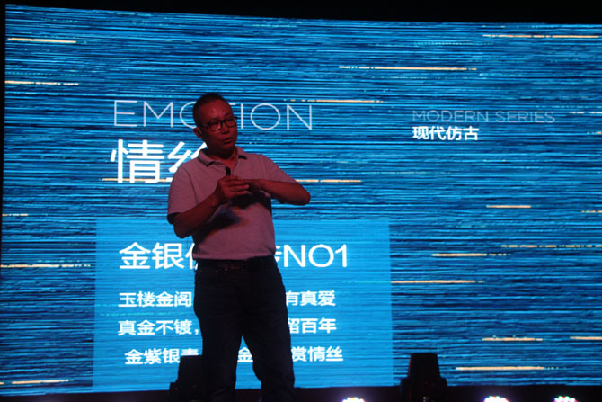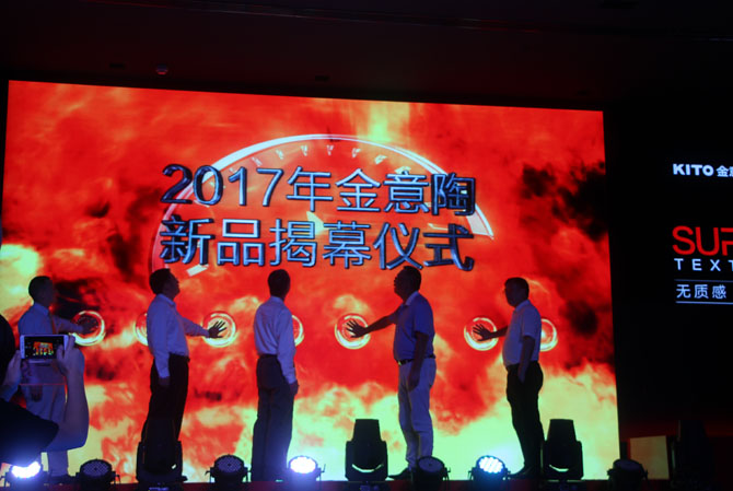 当性感外模走秀完毕之后,何乾与缪斌、尹虹等人上台为金意陶2017年新品揭幕,“无质感,不超级”的宣传口号揭示了金意陶本次发布会的主题就是“超级质感”。随后,金意陶研发中心总经理李德英登台介绍了御砂岩、情丝、故事(第一季)等系列产品,而后负责金意陶终端展厅解决方案的例外公司负责人赵凌云讲解了在金意陶终端展厅推行标准店的相关事宜。