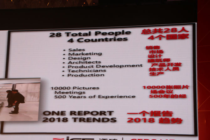 “有一千个观众,就有一千个哈姆雷特”,对于同样一个博洛尼亚展,不同的参观者自有不同的观感,但像ICC瓷砖这样组织4个国家28名成员集体(分区域)观展,然后向全行业交出一份报告的品牌,却独此一家(至少国内如此)。因此,每年ICC瓷砖的国际瓷砖流行趋势发布会就成了吸引行业人士关注的一大盛事。