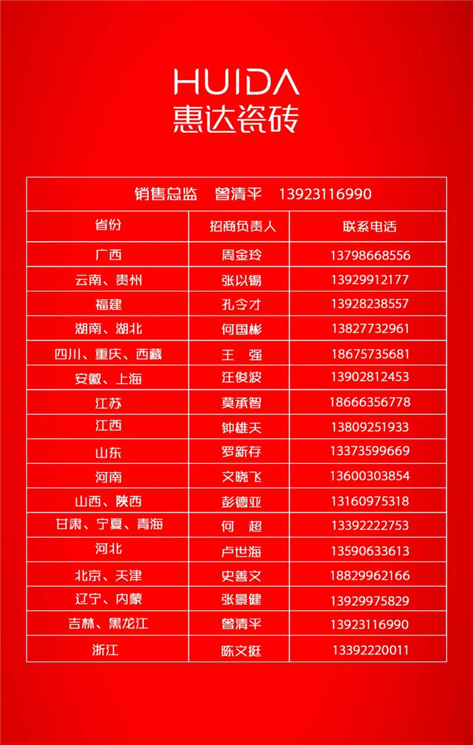 惠达瓷砖现正在全国范围内臻选优质加盟商!如果您行事果敢、勇于改变;如果您眼光独到;如果您有良好的经营能力及良好的资源,那么,马上加入惠达瓷砖,来抢占财富C位吧!