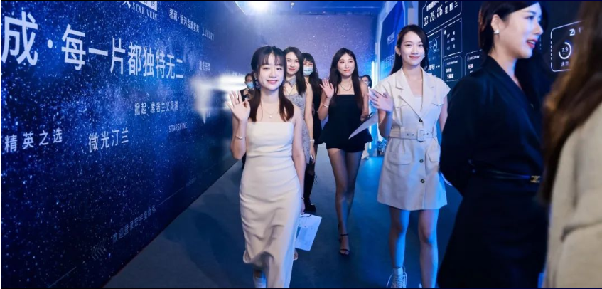 笔者在现场感受到,星纹素奢砖远不止于“素”。首先是纹路方面,在创新工艺的加持下,自然形成独特无二的纹理极富想象力,仔细观察可以窥见宇宙星河,伸手触摸仿佛可感受生命脉络般的无限伸展;其次是光感方面,与普通哑光产品的格调不同,星纹素奢砖在光影照射下,纹路间闪现着流动光泽与质感,每一片纹理均拥有微光轻烁的流光效果。无论是纹理形态、瓷砖光感亦或触感,都在重塑和颠覆市场对“素色砖”的感官印象。