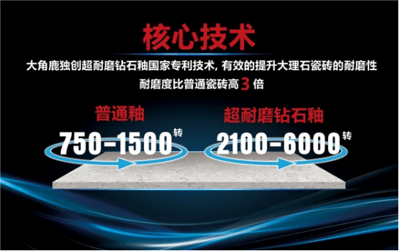 2019年,大角鹿向市场抛出“重磅炸弹”,由其独创的第一代“超耐磨钻石釉”技术问世,并推出超耐磨大理石瓷砖,拥有高于普通瓷砖3倍的耐磨度,开创中国超耐磨瓷砖新品类。