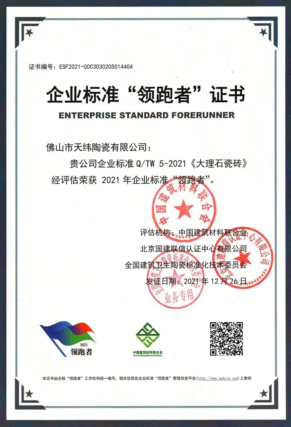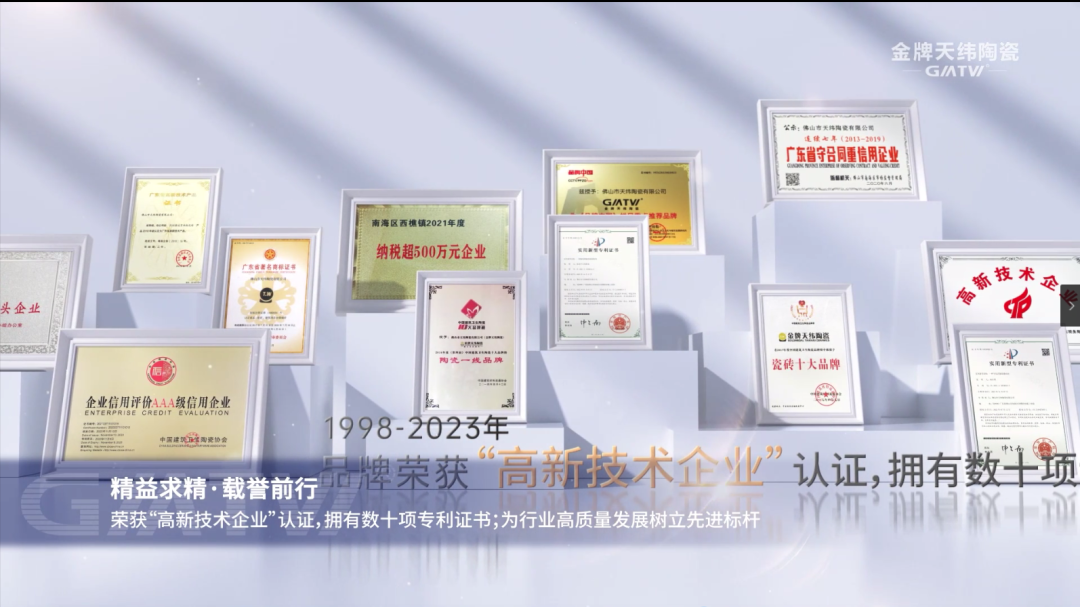 以匠心与创新筑就的卓越实力深受各界认可,金牌天纬陶瓷凭实力连续多年获得“企业信用评价AAA级信用企业”,连续两年入选企业标准“领跑者”企业,获得佛山市专精特新企业称号,佛山市细分行业龙头企业,广东省重点商标保护名录等多项重量级荣誉!