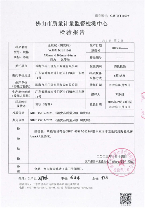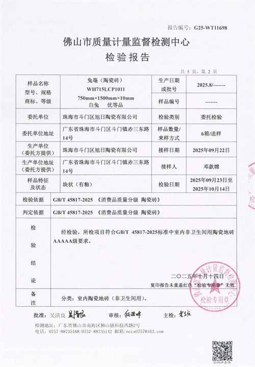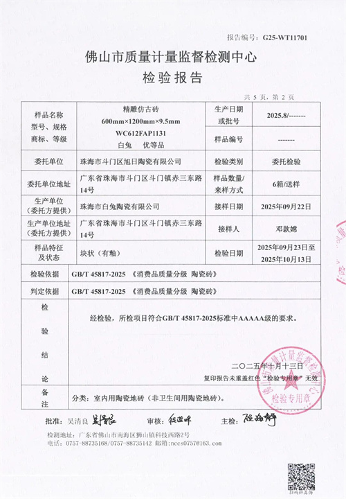 2025年,中国建材行业迎来历史性变革——《消费品质量分级 陶瓷砖》国家标准(GB/T 45817-2025)将于12月1日正式实施,标志着陶瓷砖产业迈入“质量分级、精准评价”的新纪元。在此行业转折点,白兔瓷砖送检产品经国家级权威检测机构严格测试,成功通过GB/T 45817-2025新国标认证,成为行业内首批通过新国标AAAAA级(5A级)最高质量等级认证的品牌之一,以硬核实力诠释“品质创造”的企业内核,为行业高质量发展树立标杆。