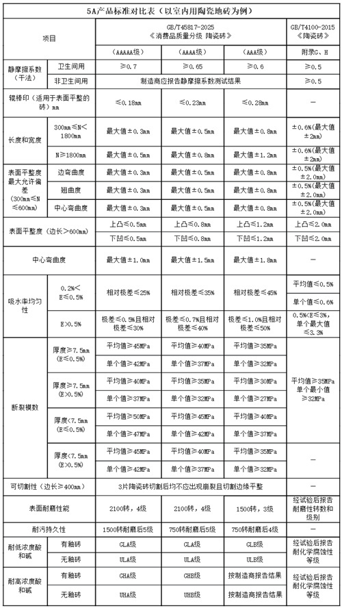 此次实施的陶瓷砖新国标堪称“史上最严”,建立 3A、4A、5A 等级体系,实现品质可视化,为消费者选购提供明确依据。其中 5A 等级对标国际领先水平,在吸水率、防滑性、耐污持久度、抗化学腐蚀等关键指标上设定严苛标准,成为高端瓷砖的核心评判标尺。