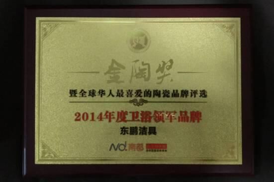 华夏陶瓷网讯 6月5日下午,第三届金陶奖暨全球华人最喜爱的陶瓷评选活动颁奖典礼在佛山创意产业园举办,东鹏洁具凭借20多年来对卫浴的研发、制造、销售和服务的专注以及2014年的品牌贡献,从众多参评卫浴企业中脱颖而出,荣膺金陶奖“2014年度卫浴领军品牌”。