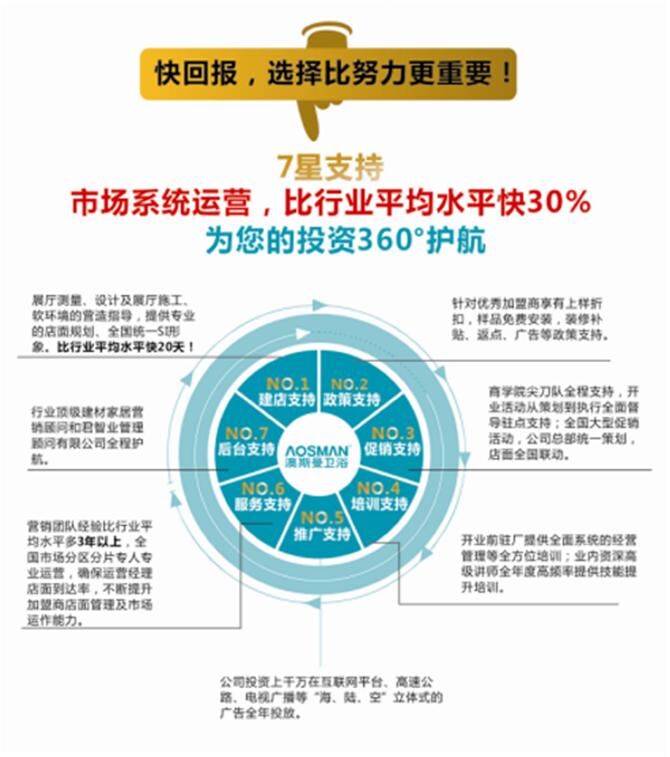 为了让更多的人参与到澳斯曼的事业版图中,通过几年的整合,2015年,澳斯曼推出行业独有的一套快速盈利系统——M6终端盈利系统!这套系统将更好更快地解决现在卫浴经销商在终端销售出现的各种痛点,帮助经销商实现持续快速的盈利!