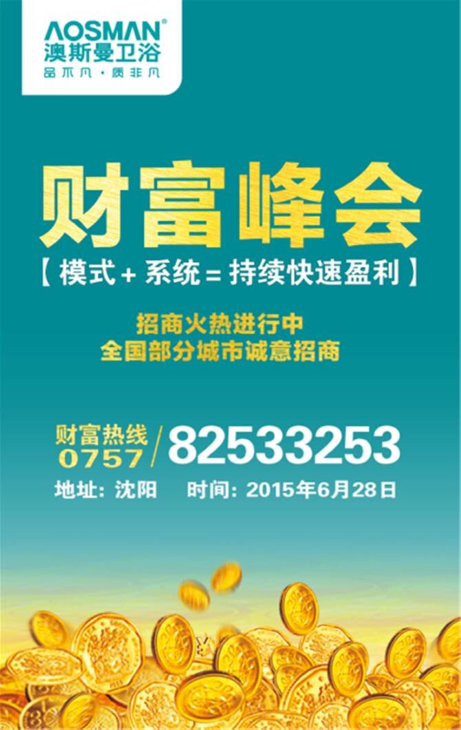 未来,是系统+模式赢得天下的时代,卫浴行业在大洗牌的过程中,剩下来的企业将寥寥可数!相信,选择澳斯曼卫浴,将是你事业发展的明智之举!2015年6月28日,澳斯曼卫浴招商峰会——沈阳站,期待您的光临!财富电话:0757-82533253
