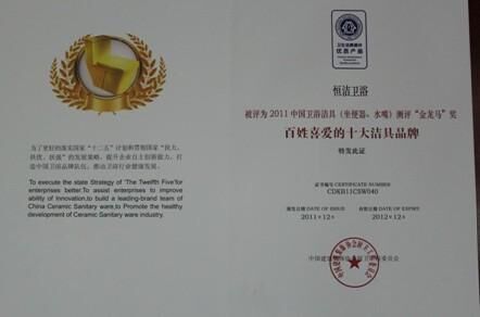 百姓喜爱的十大洁具品牌证书