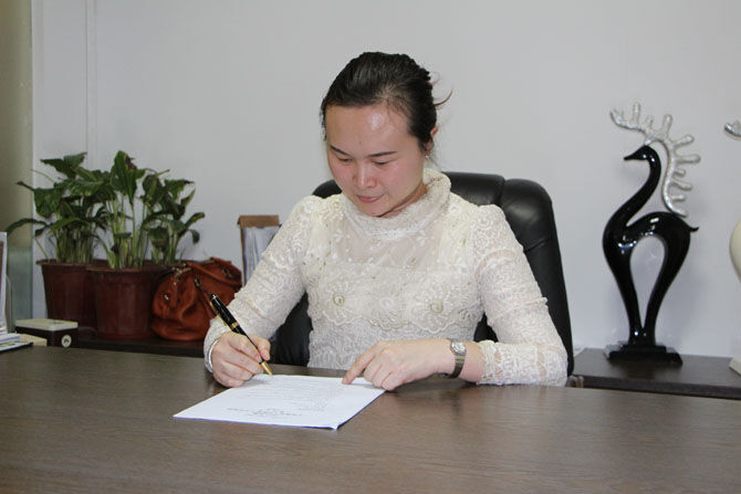 邱萍正准备在一份文件上签名