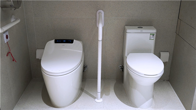 同时,为了有更强的智能化和便捷性体验,在无障碍区和亲子区选用拥有一键旋钮、活水即热、水漩能冲水、智能翻盖、恒净除菌系统等多项专利技术加持的恒洁Q9智能一体机,给特殊人群的如厕带来加倍呵护。