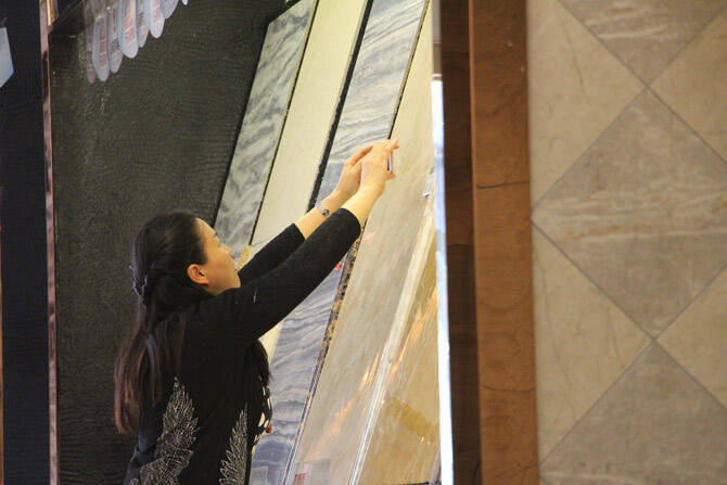 一位业主在几何瓷砖专卖店选产品
