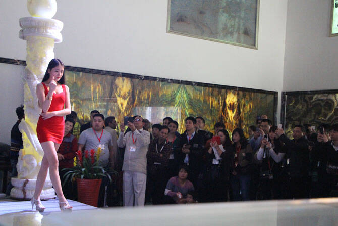 记者在现场注意到,东星集团的展品相当高端,除各类玉石、宝石之外,还有相当多的动植物化石,展馆正中位置一颗硕大的宝石更是吸引了众多参观者合影留念。据了解,在东星集团展馆外的墙上有一幅“孔雀开屏”,绚丽的七彩花衣上镶嵌着60颗珠宝玉石,特别是孔雀冠上那颗祖母绿,更是来自东星集团副总裁蔡小郭的个人收藏。蔡小郭表示,东星集团希望国内外宾客可以在东星分享世界各地最美的奢石。而随后的模特走秀,模特们身着与石材同款的服装,或是佩带着不同的宝石饰品,让东星集团的各种珍稀石材、宝石逐一亮相,强烈地吸引了来宾的眼球。
