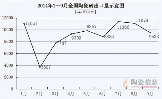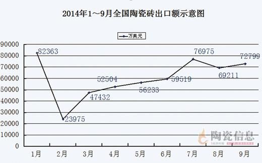 中国建筑卫生陶瓷协会公布的数据显示,2014年1~9月份,我国建筑陶瓷砖出口82500万平方米,同比下降1.1%。其中,第一季度出口22501万平方米,同比减少676万平方米,下降2.92%;第二季度出口28002万平方米,同比减少1234万平方米,下降4.22%;第三季度出口31977万平方米,同比增加928万平方米,增长2.99%。