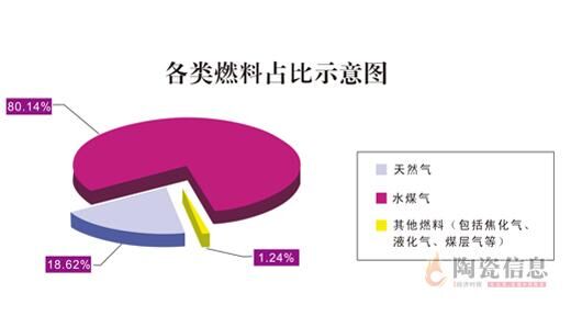 “陶业长征Ⅳ——全国陶瓷砖产能及产区发展大型实地调研活动”调查结果显示:截止目前,在全国各产区陶瓷厂使用的主要燃料中,水煤气依旧占据着最大的比重,约为80.14%.