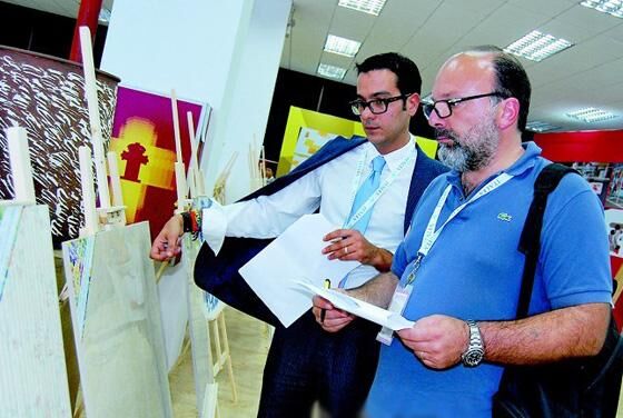 首届大赛上,设计学院教授贾科莫(右)与卡斯塔(左)在讨论产品
