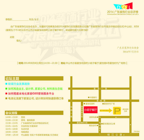 由广东省装饰行业协会主办,华夏时代传媒承办的2014装饰行业发展趋势论坛暨广东省装饰行业年度总评榜启动仪式(中山站),8月8(星期五)下午3时正在中山市沙溪星宝花园吧小胡子餐厅举行,现诚邀您拨冗出席为盼!
